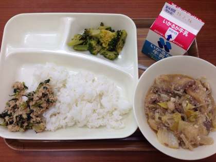 2月8日(金)のこんだては「すき焼き煮、ブロッコリーのしょうがづけ、ツナっ葉いため、ごはん、牛乳」です。