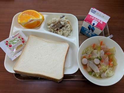 2月13日(水)のこんだては「押し麦のグラタン、スープ、デコポン、食パン、りんごジャム、牛乳」です。