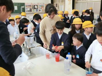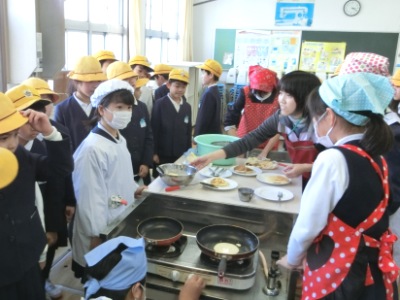 今日は、3年生の児童はクラス毎に教室を出発し、運動場で活動する陸上部【写真中】やボール運動部、バスケットボール部を見学しました。理科室では科学クラブ【写真左】が糊でスライムを作る実験をしていました。家庭科室では料理クラブ【写真右】がホットケーキを焼いているところで、いい匂いが漂っていました。3年生は自分の入りたいと思うクラブの場所では、興味深く見ていました。