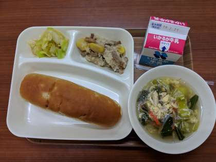 2月15日(金)のこんだては「中華おこわ、卵スープ、キャベツのオイスターソースいため、おさつパン、牛乳です。