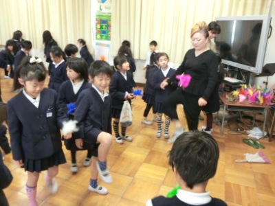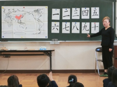 中国のゲストティーチャーから、中国の簡単なあいさつを教えてもらいました。そして、漢字の一から十までの発音や、文化について学習をしました。最後は中国の遊び「チェンズ」【写真右】を全員でしました。続けて蹴るのは、とても難しかったです。今年度は6年生は2限、4年生は4限に同様の授業を行いました。どの学年も授業を通して、多様な文化を知り、中国について理解を深めることができました。
