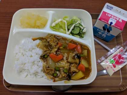 2月28日(木)のこんだては「ポークカレーライス、グリーンサラダ、洋なし(カット缶)、牛乳」です。