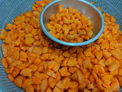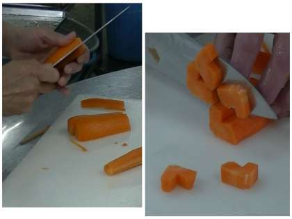 ポークカレーライスにはラッキーにんじんが入っています。いちょう切りのにんじんのうち、一部をハート形に切っていて、月に2回ほど登場します。ハート形は型で抜いていると思っている児童もいましたが、手で切っています。にんじんを4つ割りにし、真ん中にv字の切り込みを入れます。角を少し落として丸みをつけたら、あとは端から小口切りにすれば、かわいいハート型のにんじんがたくさん出来あがります!