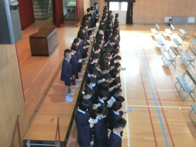 6年生は講堂に集合し、ひな段の上に並び「旅立ちの言葉」を練習【写真左・中】しました。まだ言葉や順番も全部は覚えていませんが、これから練習を重ねて本番を迎えます。旅立ちの言葉のなかで歌う「最後のチャイム」は、CDに合わせて、パート別に練習【写真右】をしました。いよいよ「卒業式」に向けて始動です。