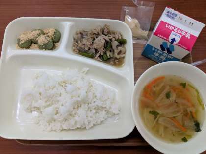 3月5日(火)のこんだては「豚肉とれんこんのいため煮、すまし汁、きな粉よもぎだんご、ごはん、牛乳」です。