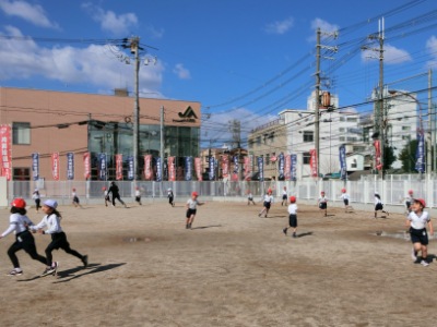 3月8日(金)2限、1年生はサブグランドで、「どろんこ遊び」をしました。全員が体操服に着替えて、集合しました。最初は体を温めるために、「おにごっこ」【写真右】をしました。