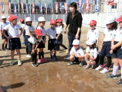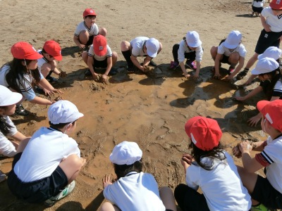 サブグランド(愛称:どろんこ広場)にできた水たまりに集まって、先生からしてはいけないことの説明【写真中】を受けました。その後は、体操服の袖を巻くって、お待ちかねのどろんこ遊び。水たまりの泥を集めて、ボールや橋、川などを作っていきました。初めてどろんこ遊びをする児童もいましたが、とても楽しそうでした。最後は大きなケーキを作って、無事終わりました。
