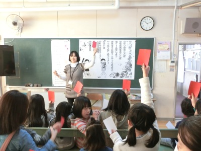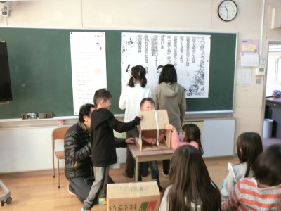 旗上げゲーム【写真左】に始まり、全員で歌をうたったり人物クイズ【写真中】をしたり、箱の中身当てゲーム【写真右】などをしました。その後、1年間の活動のスライドショーがあり、6年生からのメッセージでは、Aルームの思い出や中学生になる抱負を語っていました。6年生の児童にとっては、心に残る思い出になったことでしょう。中学生になってもAルームのことは、忘れないでくださいね。