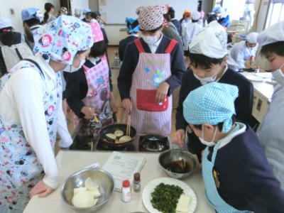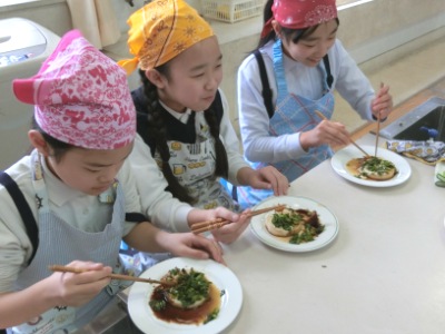 3月12日(火)5・6限、5年生は今年度、最後の「調理実習」で、「大根ステーキ」を作りました。食材は、だいこんクラブの5年生が学習園で育てた大根やかぶらで、収穫を祝いながら調理を楽しみました。