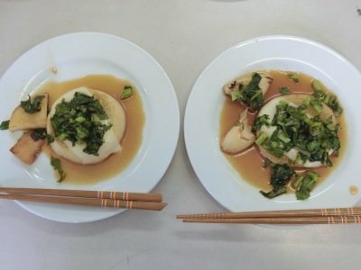 大根を切ってゆでてから、フライパンで中火で2・3分焼いて、醤油だれを掛けて、スライスチーズを載せました。トッピングはゴマ油で炒めた大根の葉です。調理実習も回を重ねて、どんどん手際がよくなっています。適度に歯ごたえがあり、焼き色も食欲をそそりました。