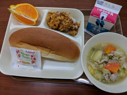 3月12日(火)のこんだては「とうふのミートグラタン、押し麦と野菜のスープ煮、デコポン、コッペパン、りんごジャム、牛乳」です。