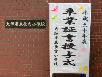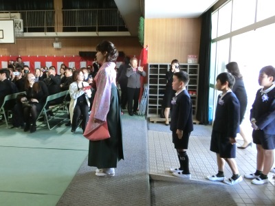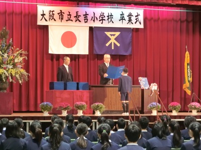 国歌・市歌斉唱、学事報告の後、6年生は校長先生から卒業証書を、一人ずつ授与していただきました。学校長式辞では、「感謝の心を忘れずに、夢の実現に向かって自立を」という、心からの祝福と激励のエールが贈られました。その後、来賓紹介とPTA会長祝辞がありました。