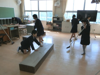 式場の体育館は、床の雑巾がけを行い、長椅子を設置していきました。1年生の教室では掃除を行い、掲示のお手伝いをしました。廊下や階段の掃除も丁寧に行いました。最高学年として、新1年生を迎えられるよう準備万端整いました。