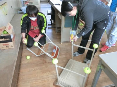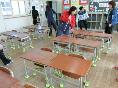 1年生の教室は、難聴児童の入学に伴い、学習机と椅子の脚にテニスボールを取付ける作業を行いました。机・椅子の引きずる音が軽減されることになります。