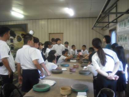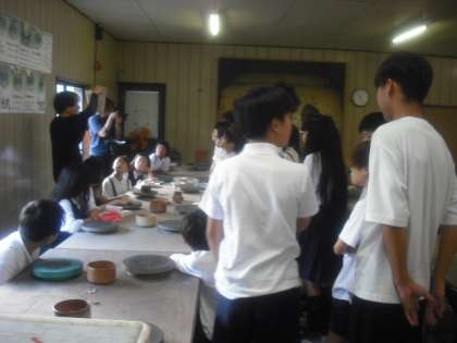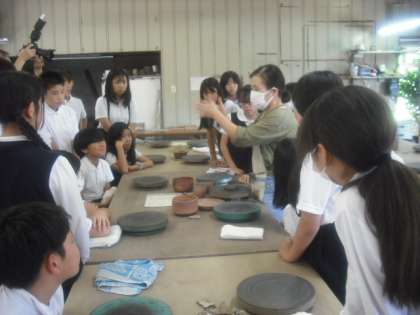 陶芸体験が始まりました。まずは作り方を教わっています。