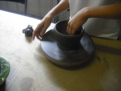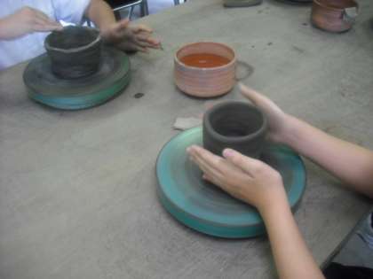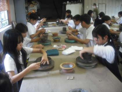 子どもたちが陶芸活動をはじめました。土をこね、ろくろで思い思いの作品を形にしていきます。コップや湯呑、お茶碗を作る子、平たくしてお皿を作る子、さまざまです。