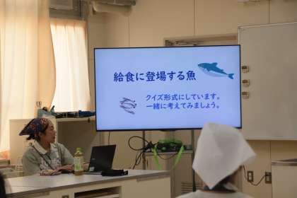教頭先生のご挨拶のあと、栄養教諭の先生が4年生に教えている授業内容の一部を紹介頂きました。「魚を食べよう」というテーマでクイズがあったり、写真があったりと、分かりやすく楽しく学べる資料になっていました。