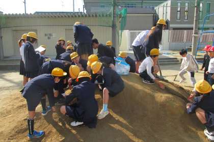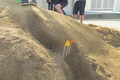 5年生は現在、理科の授業で流れる水のはたらきの学習をしています。今日は、5年2組が校庭の砂山を使って実験を行いました。子どもたちは「どのくらいの時間がかかるかな。」「外側と内側、どちらの流れがはやいのかな。」などとつぶやきながら熱心に実験を行っていました。