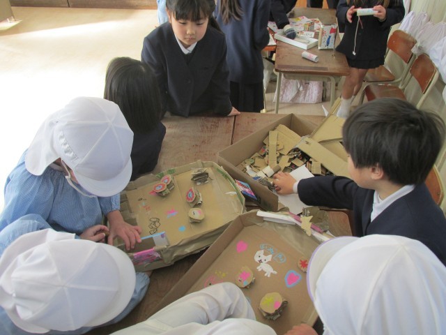 空き箱や、秋に収穫したどんぐりや葉っぱを使って工夫して作った素敵なおもちゃで、幼稚園や保育園のお友だちも楽しそうに遊んでくれていました。