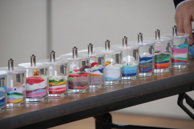 ジェルキャンドル作りでは、色鮮やかなカラー砂で土台を作り、ガラス細工や貝殻、石を使って思い思いに飾り付け、仕上げに温かいジェルを流し込んで固めます。