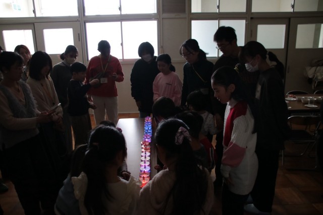 最後にLEDの明かりを灯すと、会場が色とりどりの光に包まれ、参加者に笑顔が広がりました。