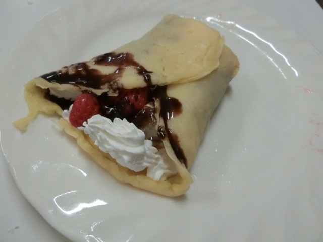 生地を焼き、果物、ホイップ、チョコソースなどをトッピングして作りました。