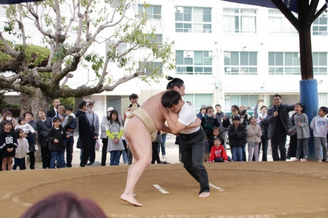 校庭横の土俵では、片男波親方の楽しい解説付きで稽古の様子を披露していただき、子どもたちは迫力あるパフォーマンスに目を輝かせていました。