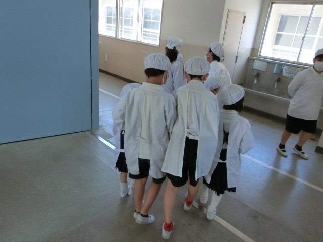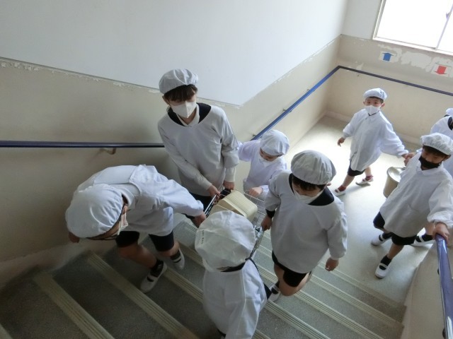 1年生のみなさんは、6年生と一緒に給食室まで給食を取りに行き、教室まで運んでいます。
