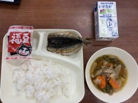 今日の献立は、 ・ごはん ・豚肉と野菜のいためもの ・いわしのつみれ汁 ・かぼち...