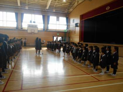 校長先生から「ここに、1年から6年までの全校の仲間が勢ぞろいしました。これから、しっかりとつながり合って、楽しく仲良く過ごしましょう。」と、お話がありました。