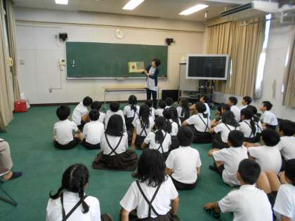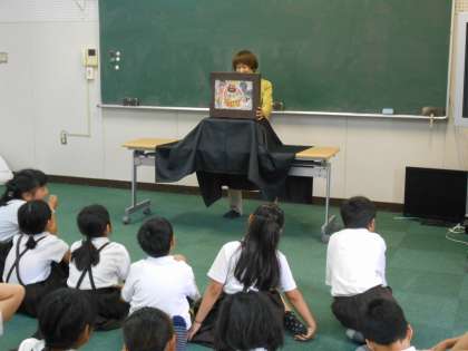 多目的室に座って、「おはなし たからばこ」の方々の読み聞かせや紙芝居を聞きました。