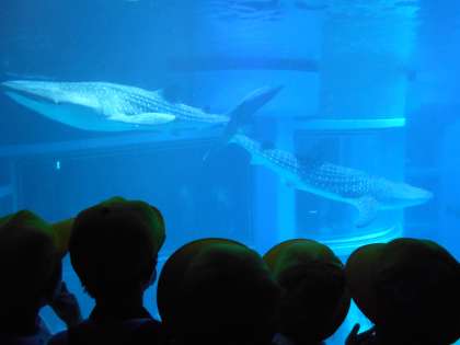 特に2匹の大きなジンベイザメには、子どもたちは大興奮でした。タイミングよく、餌やりの様子を目の前で見ることができました。