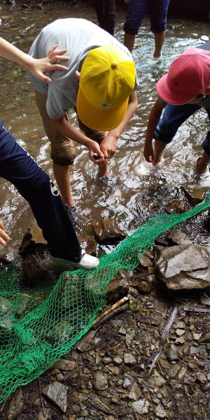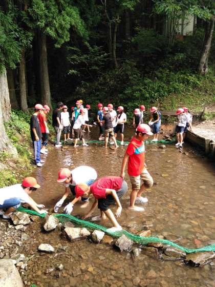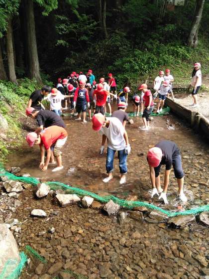 すいすいと泳ぐ魚、ニジマスを、ひんやりと冷たい谷川の中に入って捕まえます。