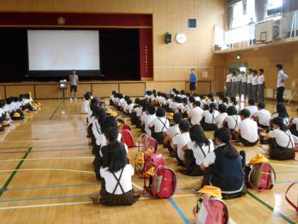 まず、生徒会の生徒さんから中学校生活の様子を聞き、中学校進学への期待を高めていました。