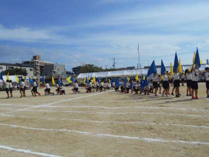 団体演技は青と黄のフラッグを使い、全員の心を一つにした「優しく 強く 美しく 〜仲間とともに〜」でした。6年生みんなの思いが一つになり、一生懸命の演技には、会場中の人々に感動を与えました。