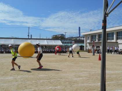 「大玉運び」では、棒ではさんだ大玉を落とさずに運ぶのが難しそうでした。特に折り返し地点では苦戦するペアが続出していましたが、うまくバランスを取りながら進みました。