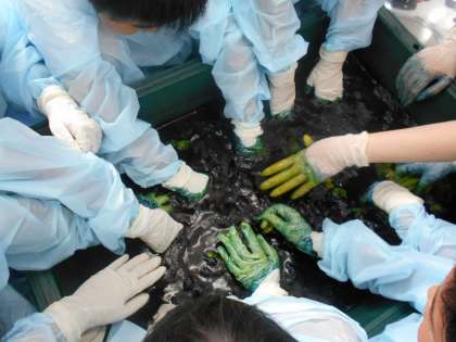 最初は緑色だった布が、だんだんと濃い藍色に染まっていく様子に、子どもたちは驚いていました。