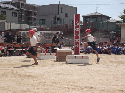 2年生は探し物競争を行いました。箱に入っているものを探し当て、ゴール前まで運びました。順位も何回も入れ替わり、見ているほうもハラハラしました。