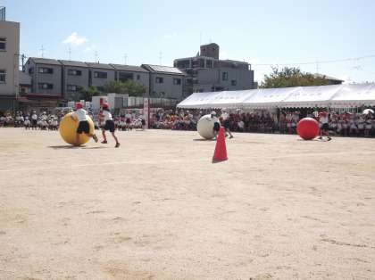 大玉ころがしでは、自分より大きな玉を協力して、上手にゴールまで運ぶことができました。
