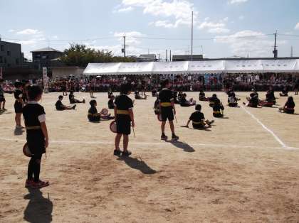 3年生のエイサーでは、みんな黒のTシャツできれいにそろえ、パーランクという打楽器のようなもので、リズムよく踊ることができました。