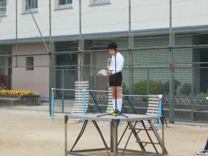児童朝会で、児童会の運営委員会の児童から、「自分からすすんであいさつしましょう」とアピールがありました。