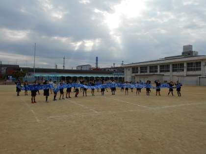 まず、前回藍染めをした布を持っての記念撮影をしました。運動場に学級ごとに並んで、みんな誇らしげに染めた布を掲げました。