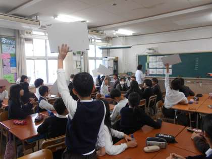その後、クイズ大会を行いました。班対抗のクイズ大会は接戦でしたが、班の友だちと協力して取り組む様子がみられました。