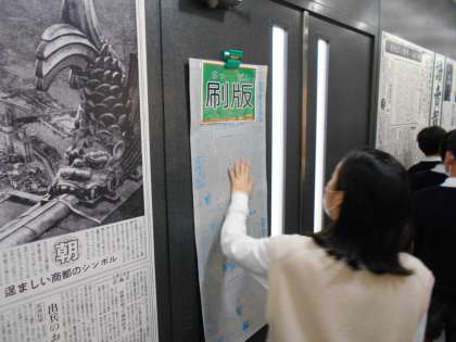 新聞社内を見学させていただき、編集部や印刷機械の動いている様子、さらに出来上がった新聞をまとめて包んで輸送の準備をするところなども見学しました。