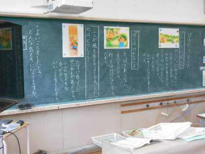 下の写真は2年生です。「ぽんたとかんた」の学習で、良いことと悪いことを見極め、自分で正しく判断しようとする態度が育ちました。