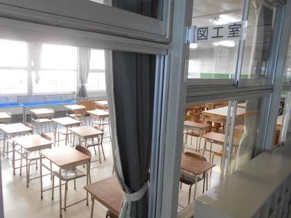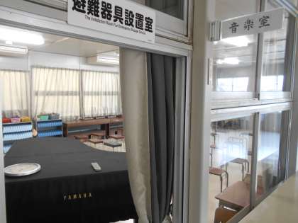 仮設校舎の2階は、4年生・6年1組の教室と音楽室・図工室があります。