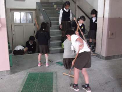普段から活動しているたて割り班で、階段やトイレ、学校前の道路までいろいろなところを掃除しました。
