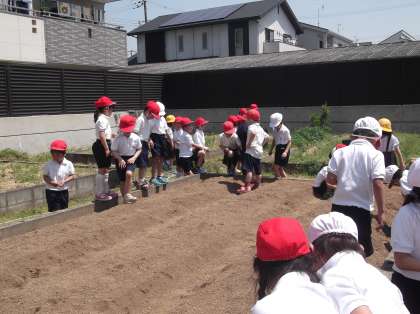 4月27日(月)、地域の方に教えていただきながら、1年生が学習園でひまわりの種まきをしました。