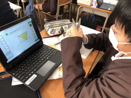 タブレットを用いて、三角形の面積の求め方を考えています。
