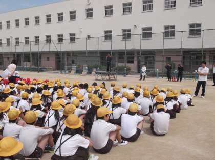 理科室から出火したとの想定で、先生の指示に従って、全校児童が運動場に避難しました。